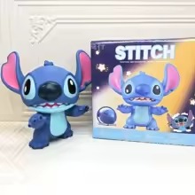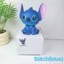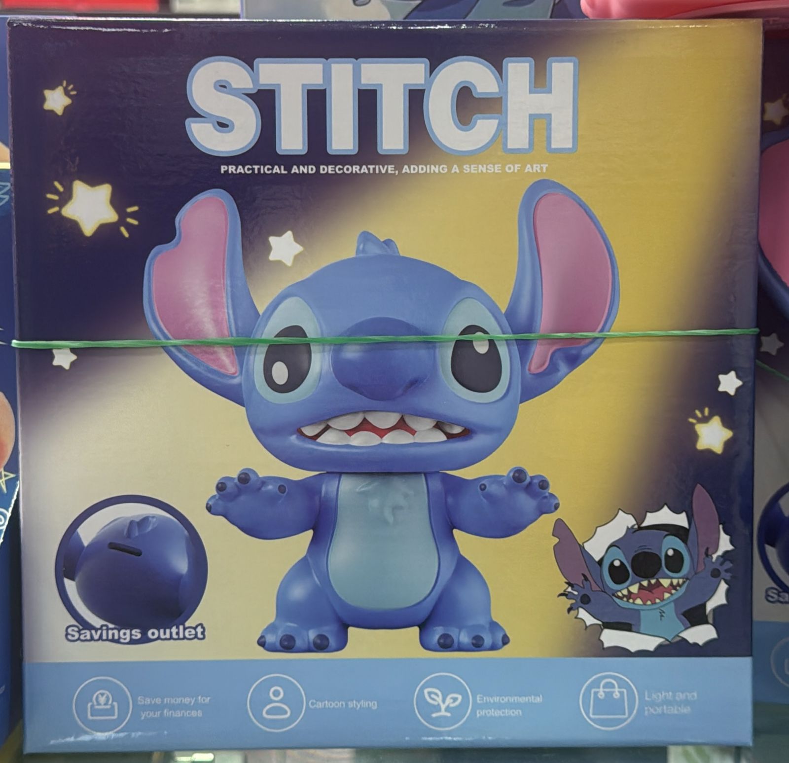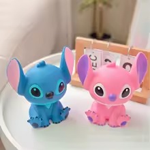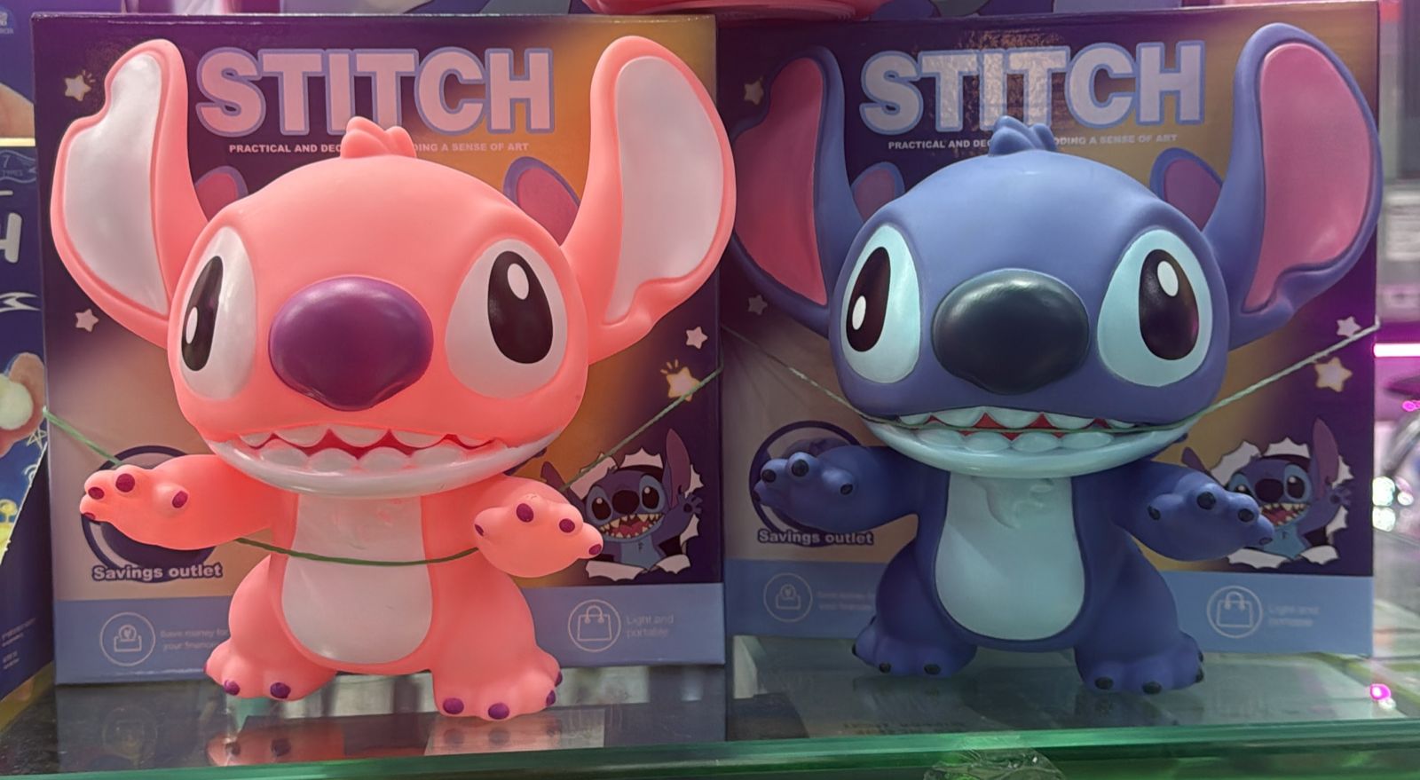 Las imágenes muestran un par de huchas (alcancías o bancos de ahorro) de los personajes de Disney Stitch (azul) y Angel (rosa), de la película Lilo & Stitch.