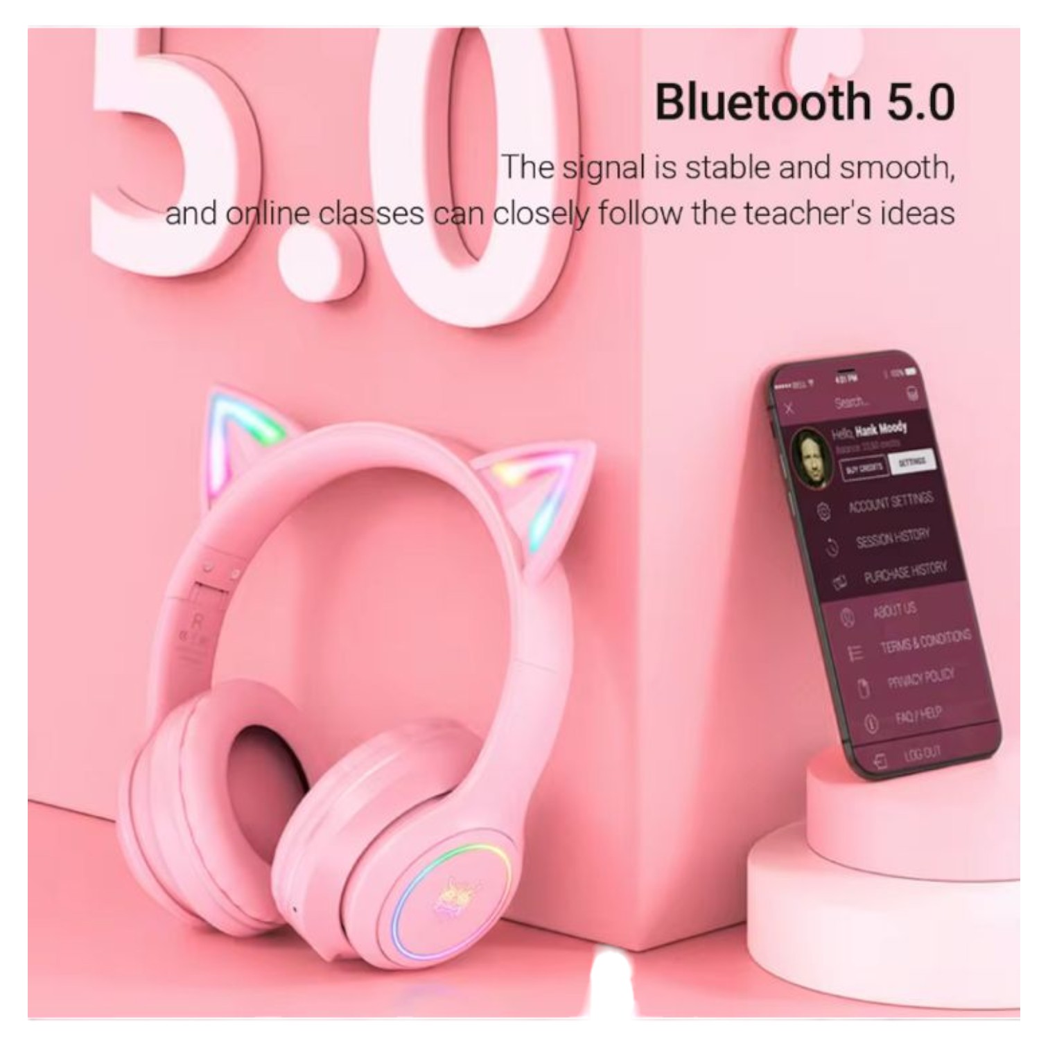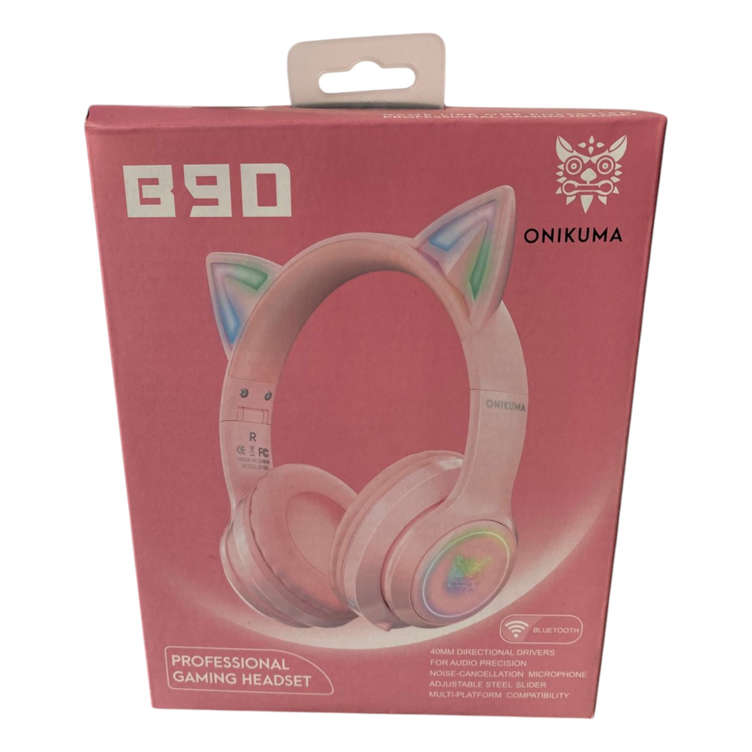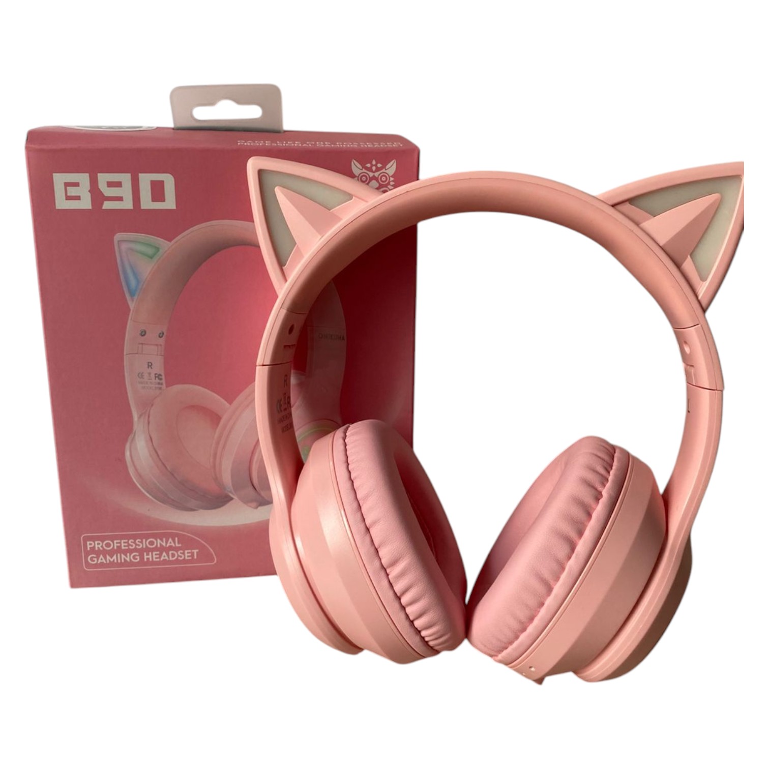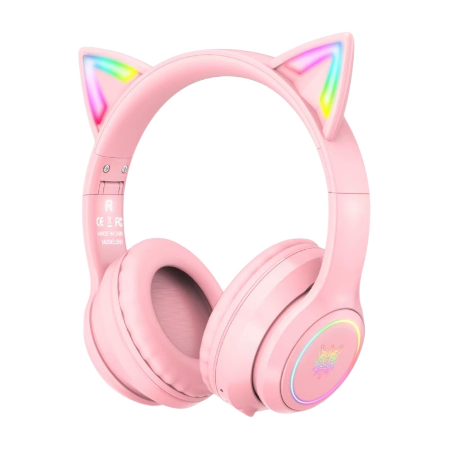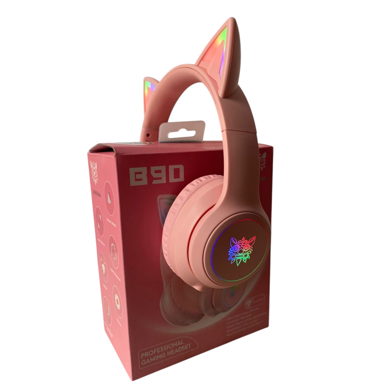 Auriculares inalámbricos Onikuma B90 en color rosa con diseño estilo gato y luz LED RGB. Ofrecen conexión Bluetooth estable, ideales para jugar o escuchar música sin cables. Incorporan control táctil, diseño cómodo tipo diadema y batería recargable de larga duración. Compatibles con celulares, tablets, portátiles y más dispositivos con Bluetooth.