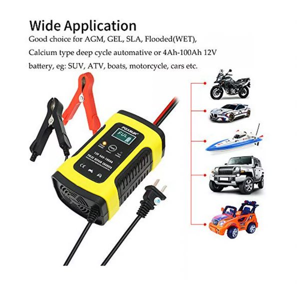 Ámbito de aplicación: Está estrictamente prohibido cargar baterías de litio. Funciona con baterías de plomo de 12V 4AH-100Ah (AGM, GEL, MF, SLA, VRLA), diagnostica y repara problemas de batería y extiende la vida útil de la batería en su automóvil, motocicleta, cortadora de césped o bote.