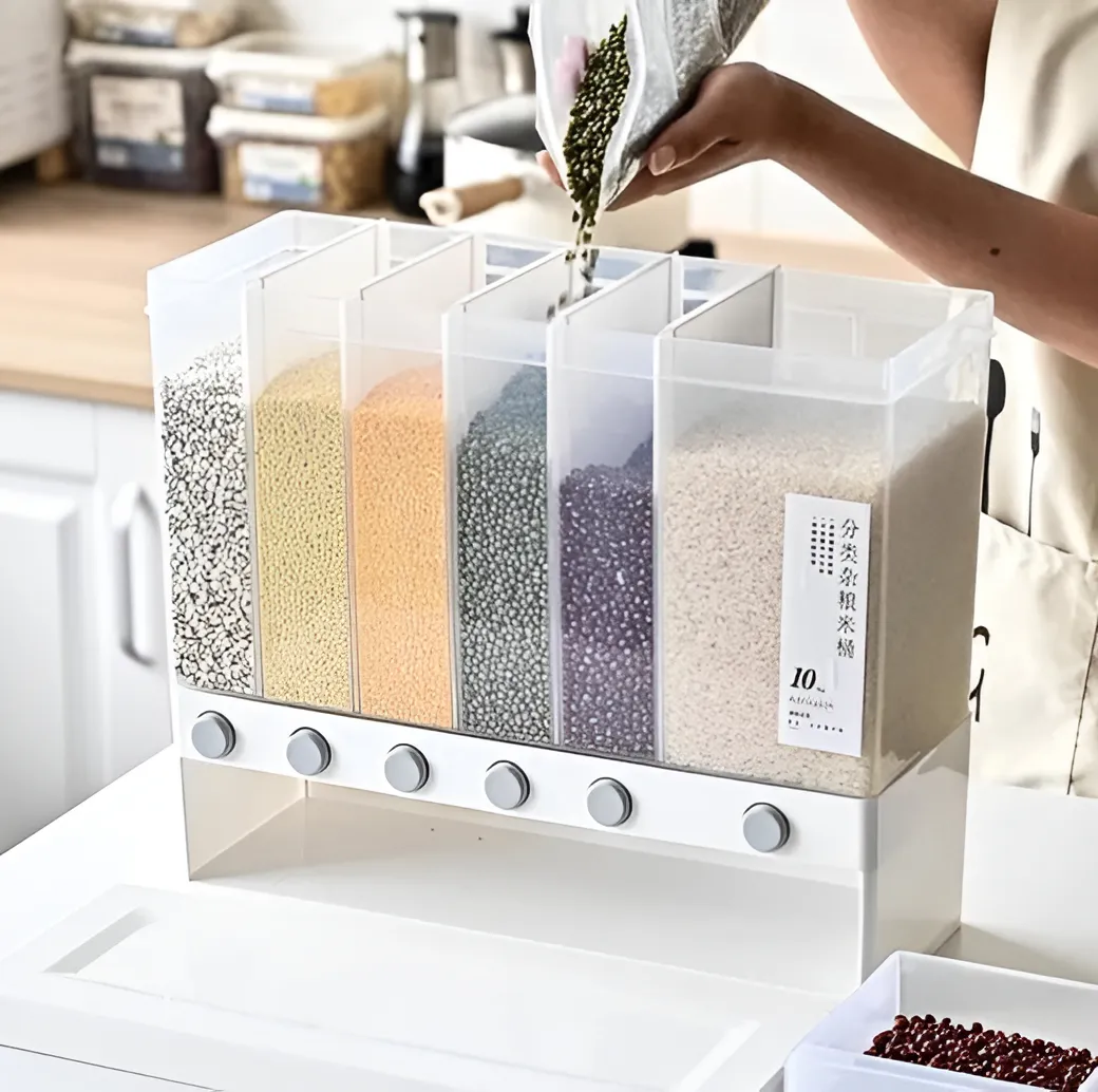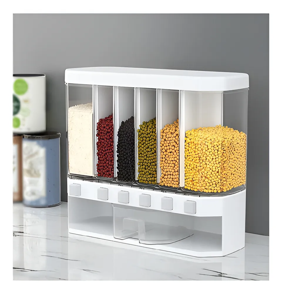 Dispensador de alimentos, arroz, granos enteros, cereales, de gran capacidad dividido en 6 espacios.