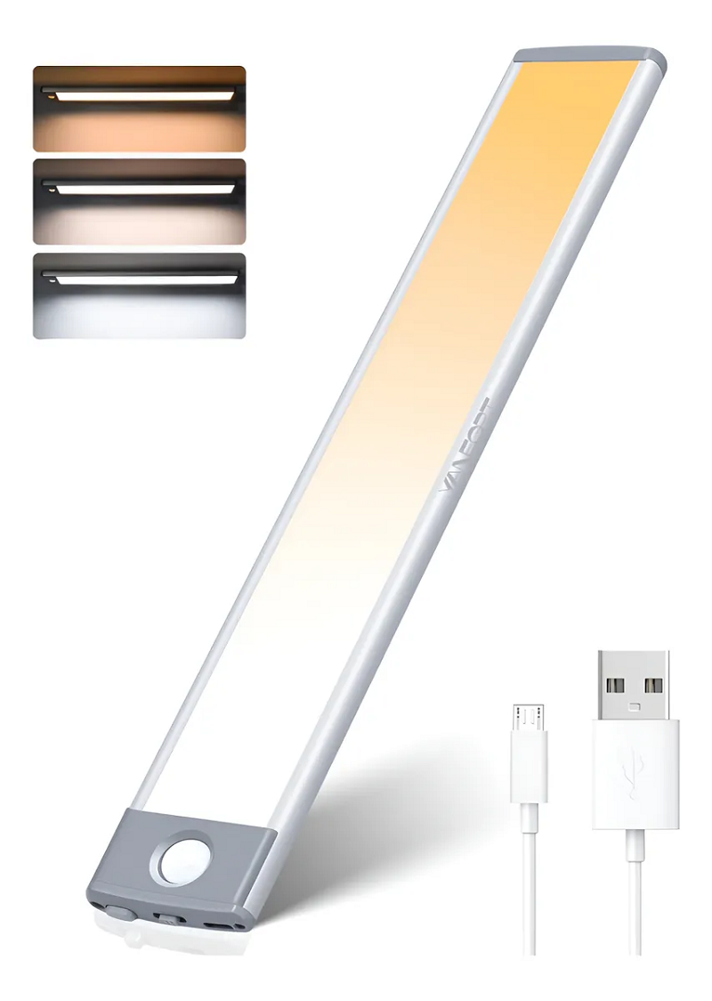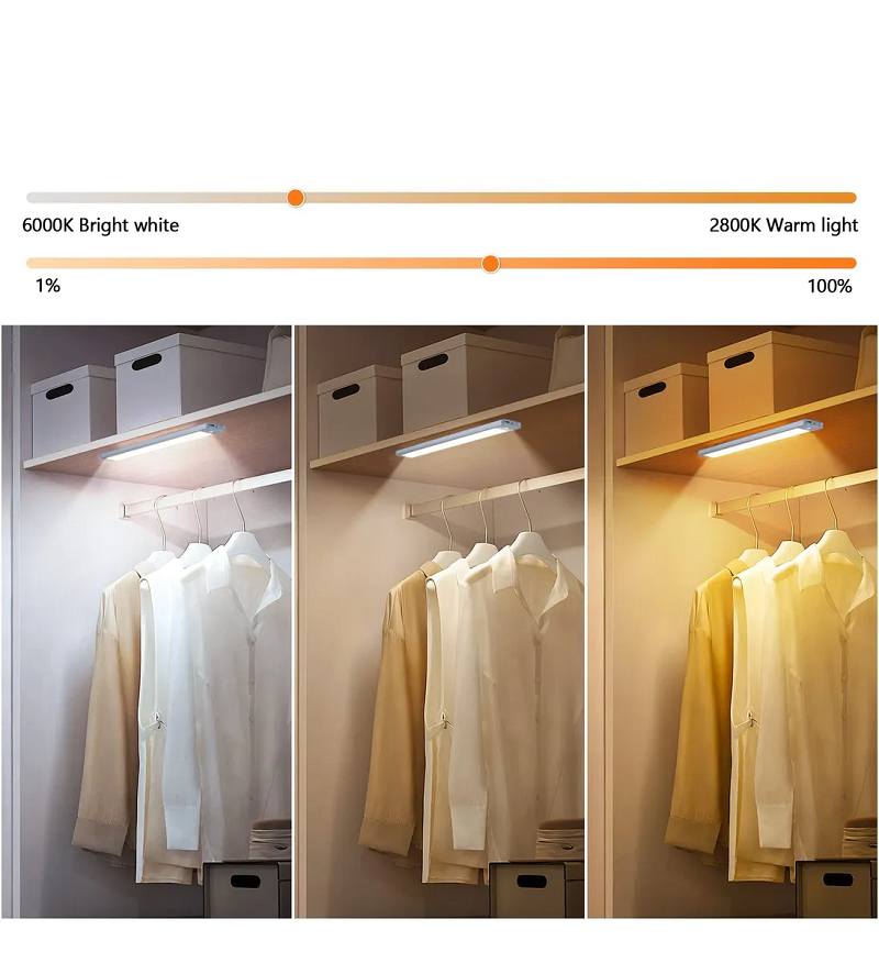 ,-3 temperaturas de color y regulablesEstas luces de armario tienen 3 colores de temperatura para elegir para satisfacer tus necesidades. Puede traerte luz brillante en la oscuridad, tambien puede proporcionarte una luz calida y suave cuando descansas y puede ajustar el brillo de la luz en cualquier momento para satisfacer tus necesidades en diferentes entornos. 2800K Luz calida/4000K Luz natural/6000K Blanco brillante 10%-100% brillo Para su eleccion.