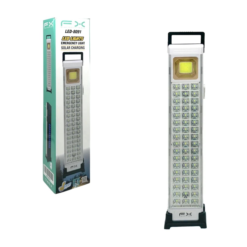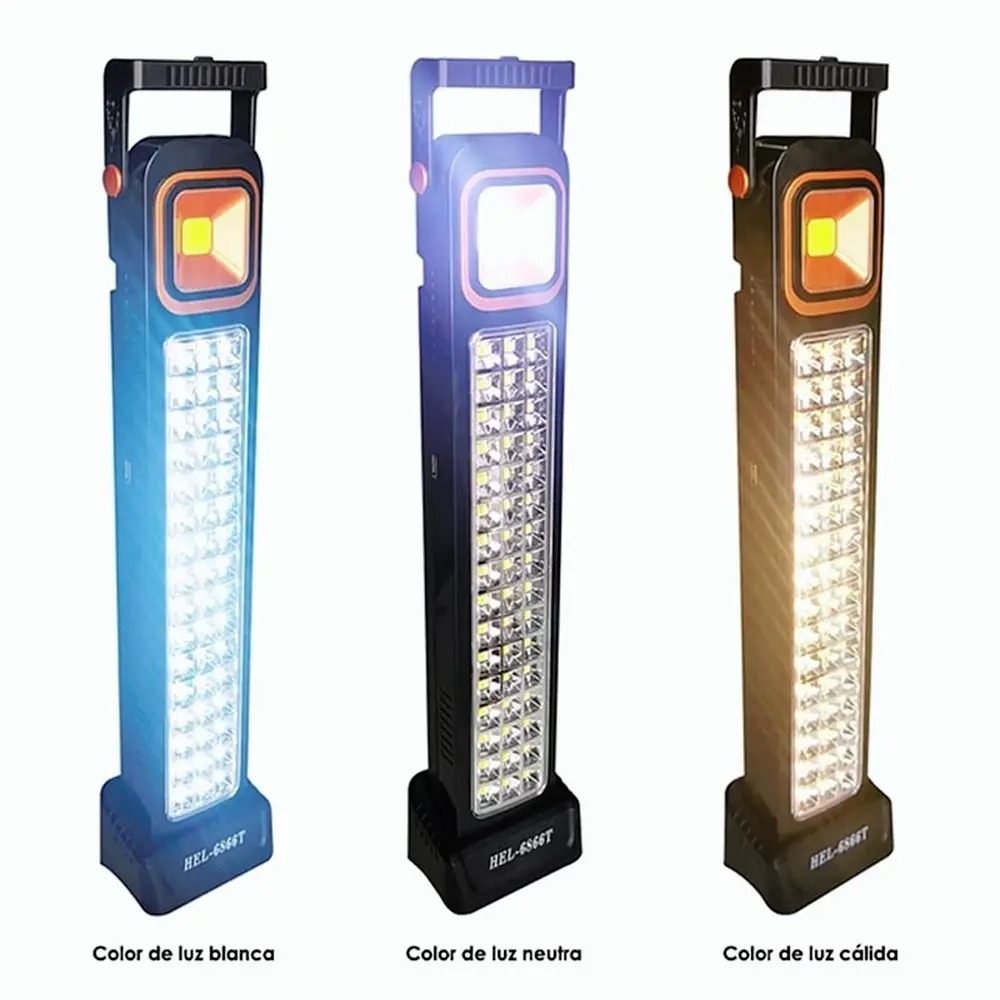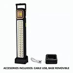 Luz de emergencia solar recargable Lámpara y luz solar Cuerpo duradero hecho de plástico de calidad, tiene un número de base para luces estáticas en la mesa y superficies lisas Equipado con 48 lámparas LED y una lámpara COB, la potencia de salida de la lámpara COB es igual a 2 vatios Color de luz de luces LED y LED fluorescentes y luces COB con luz de luna Modo de exposición de las luces LED como fijo débil (fuerte) y fijo (soleado) Lámpara COB con modo de exposición débil y fuerte, alimentada por batería de litio interna Capacidad de la batería 3600 mAh, el tiempo de carga de la batería es de aproximadamente 15 horas la primera vez y la próxima vez de 8 a 12 horas Posibilidad de recargar la batería a través del puerto micro USB y cable móvil o panel solar en el cuerpo Tiene un indicador LED, equipado con un puerto USB para carga de emergencia de teléfonos móviles Equipado con una llave física para encender y apagar las luces, cambiar el modo de exposición y alternar entre las luces Con asa plegable para colgar la lámpara o fácil de transportar, equipada con ranura para clavos/tornillos para fijar la lámpara a la pared. MEDIDAS DE LAMPARA: Alto 42cm aprox. Ancho 8cm aprox. Profundidad 5cm aprox.