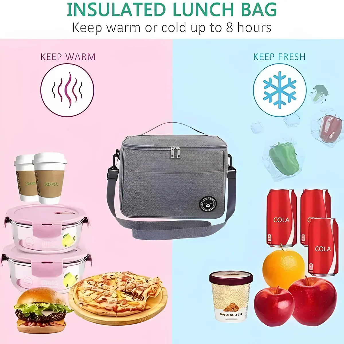 ¡Lleva tus comidas a cualquier lugar con comodidad y estilo! Nuestra lonchera aislante es perfecta tanto para mujeres como hombres, y es ideal para adultos y niños. Diseñada para ser tu compañera diaria, te ofrece practicidad, espacio y durabilidad.