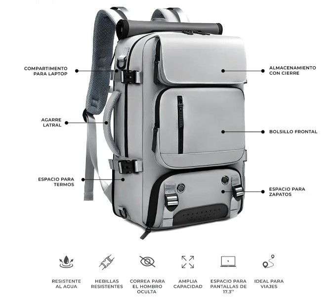 🧳 Diseño inteligente: múltiples compartimientos para tu laptop, documentos, ropa, audífonos, cargadores y más.