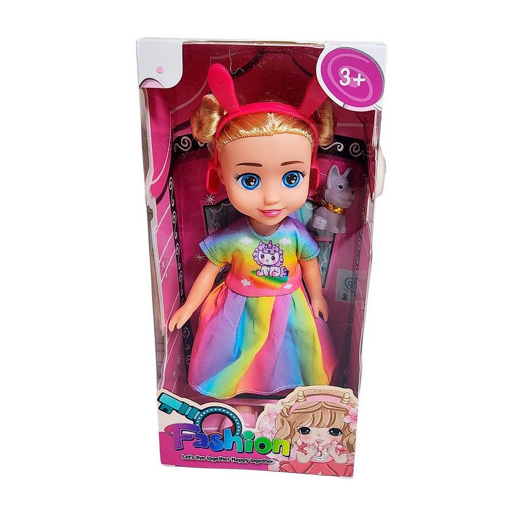 Celebra un mundo de color y amistad con esta adorable muñeca "Fashion" de la colección "Let's live together. Happy together." Esta encantadora muñeca, con su cabello rubio peinado en dos divertidos moños, destaca por su atuendo vibrante: un vestido completo y una simpática diadema rosa con orejitas. Pero la diversión no viene sola, ya que la acompaña su inseparable y diminuta mascota, un tierno perrito gris. Es el regalo perfecto para niñas mayores de 3 años, ideal para inspirar horas de juego imaginativo y las historias más coloridas.