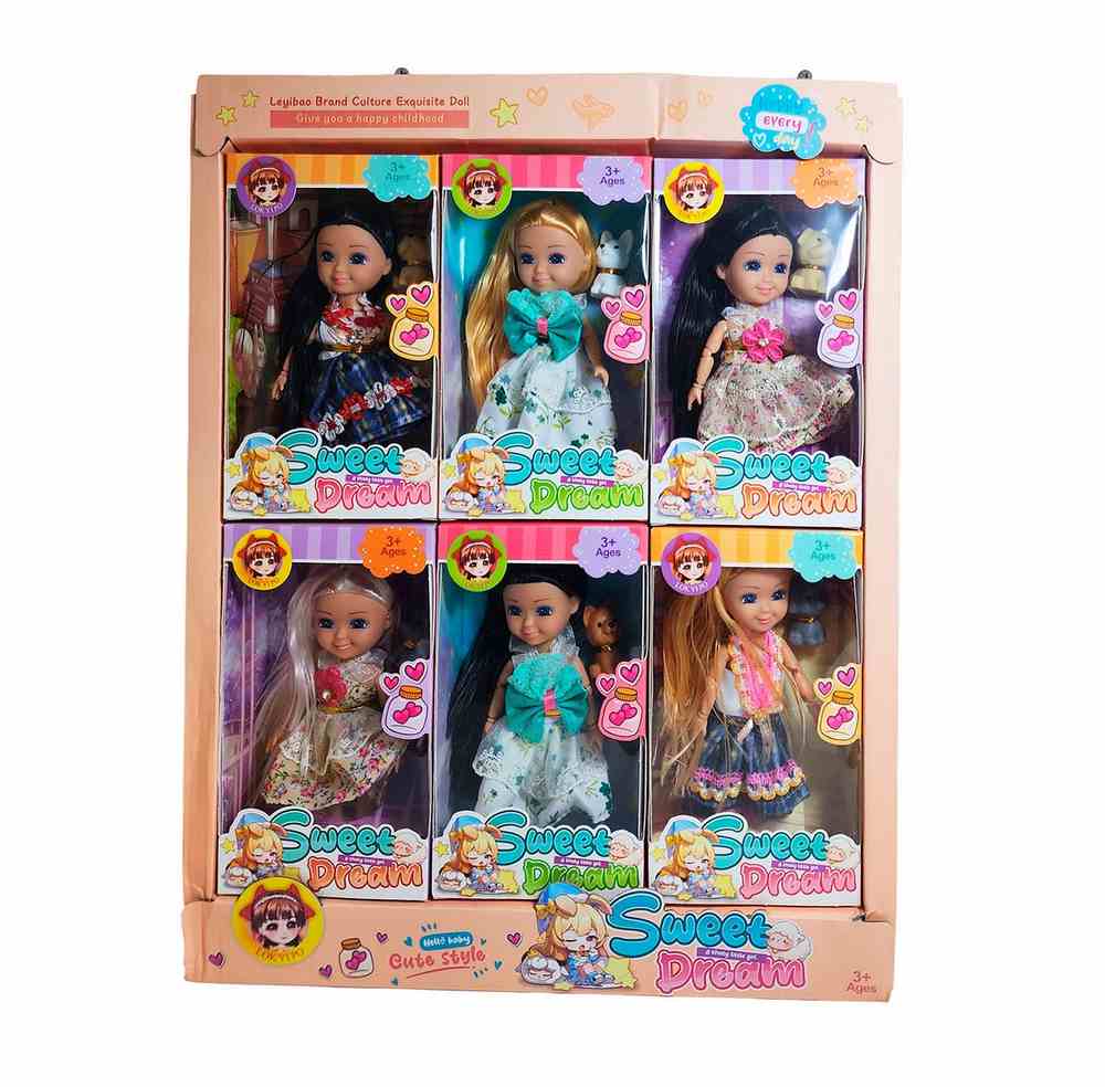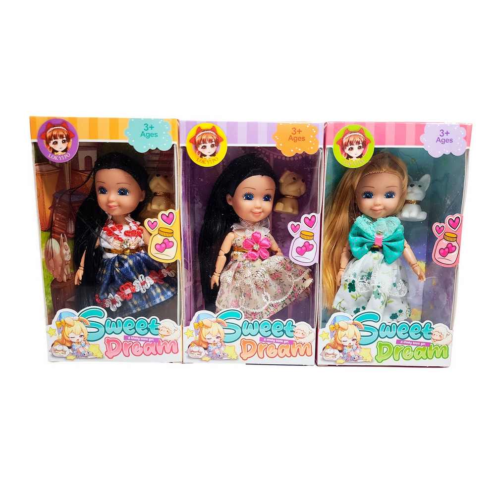 Descubre el encantador mundo de las muñecas "Sweet Dream", el regalo perfecto para tener una infancia feliz ("Give you a happy childhood"). Esta adorable colección presenta una variedad de muñecas articuladas, cada una con su propio estilo único, incluyendo diferentes colores de cabello (rubio, negro) y hermosos atuendos, como vestidos florales o faldas con collares. Pero la dulzura no termina ahí: cada muñeca viene acompañada de su inseparable y diminuta mascota, un tierno perrito. Ideales para niñas mayores de 3 años, estas muñecas son perfectas para coleccionar e inspirar horas de juego imaginativo y dulces sueños.