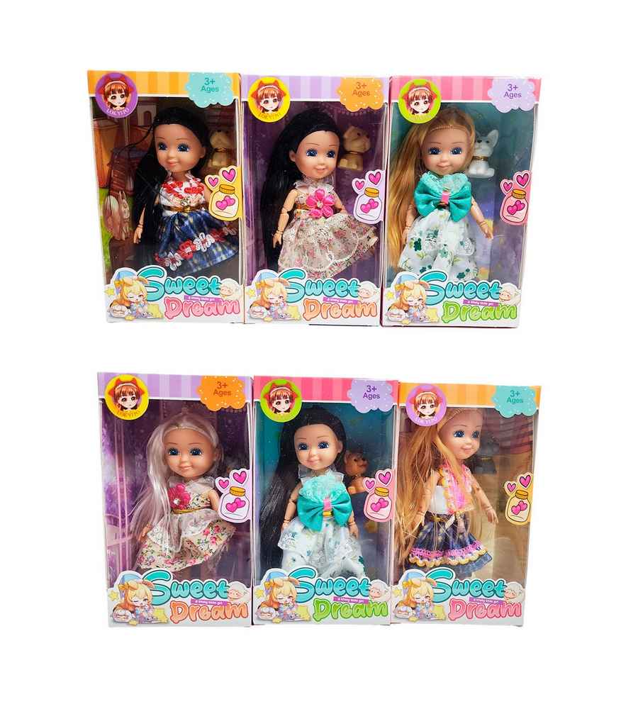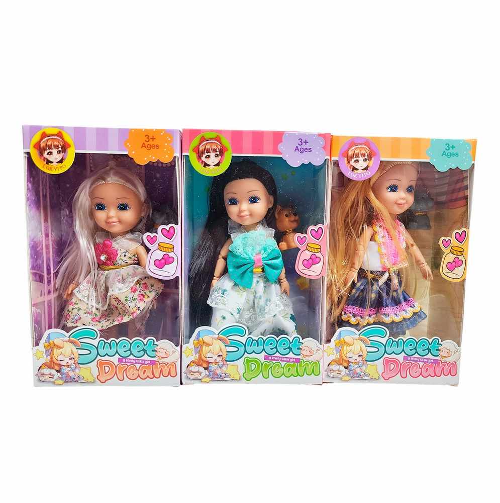 Descubre el encantador mundo de las muñecas "Sweet Dream", el regalo perfecto para tener una infancia feliz ("Give you a happy childhood"). Esta adorable colección presenta una variedad de muñecas articuladas, cada una con su propio estilo único, incluyendo diferentes colores de cabello (rubio, negro) y hermosos atuendos, como vestidos florales o faldas con collares. Pero la dulzura no termina ahí: cada muñeca viene acompañada de su inseparable y diminuta mascota, un tierno perrito. Ideales para niñas mayores de 3 años, estas muñecas son perfectas para coleccionar e inspirar horas de juego imaginativo y dulces sueños.