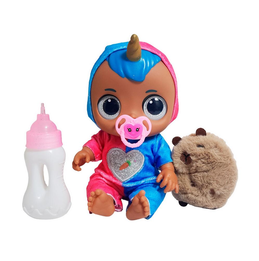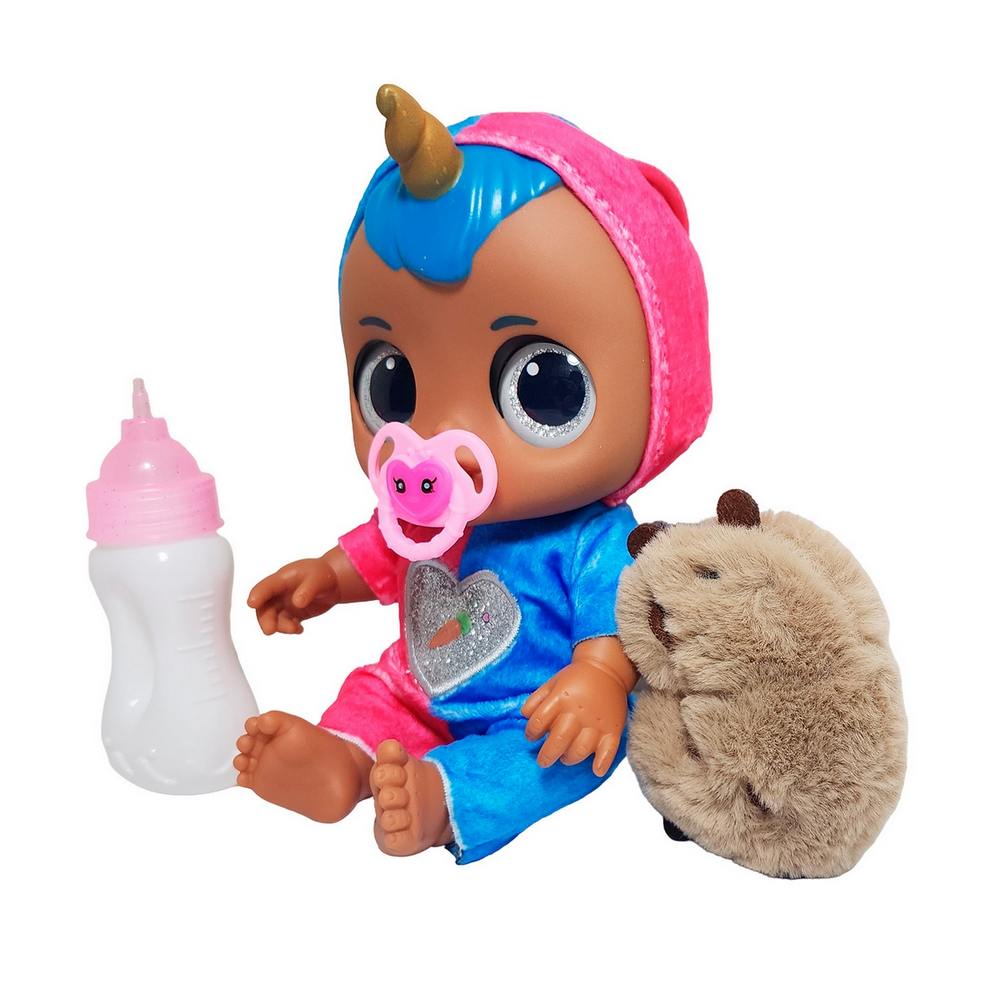 Experimenta un mundo de magia y cuidados con esta adorable muñeca "Fad Lovely Baby", la compañera interactiva perfecta para tu pequeña. Esta encantadora bebé, con expresivos "3D Eyes" y un fantástico look de unicornio, luce un mameluco y una capucha a juego con cuerno dorado y cabello . El set se completa con su tetero, un tierno chupón rosa y una adorable mascota de peluche marrón y esponjosa, lista para unirse a las aventuras y brindar horas de juego imaginativo.