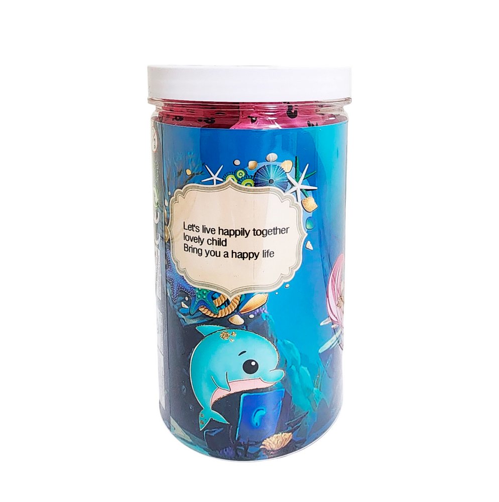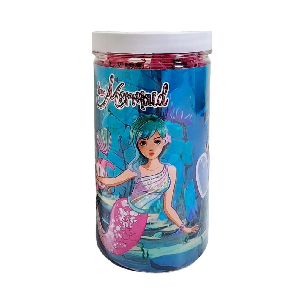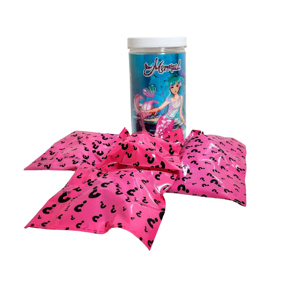 Despierta la emoción y la curiosidad con este fascinante tarro de sorpresas con temática de sirena y océano. Este vibrante contenedor azul, decorado con una encantadora sirena y un delfín, es la puerta de entrada a un mundo de diversión unboxing. En su interior, tu pequeña descubrirá múltiples bolsitas sorpresa de color fucsia, cada una marcada con signos de interrogación que esconden un misterioso juguete o accesorio. Es el regalo perfecto para las amantes de las sirenas y la emoción de revelar un tesoro oculto en cada paquete.