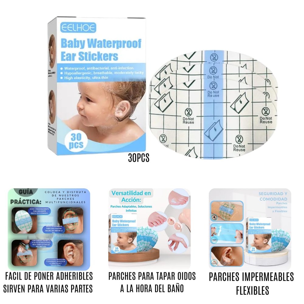 Presentamos nuestros parches protectores para oídos de bebé, diseñados para mantener sus orejitas secas y seguras durante el baño, la ducha o la piscina.