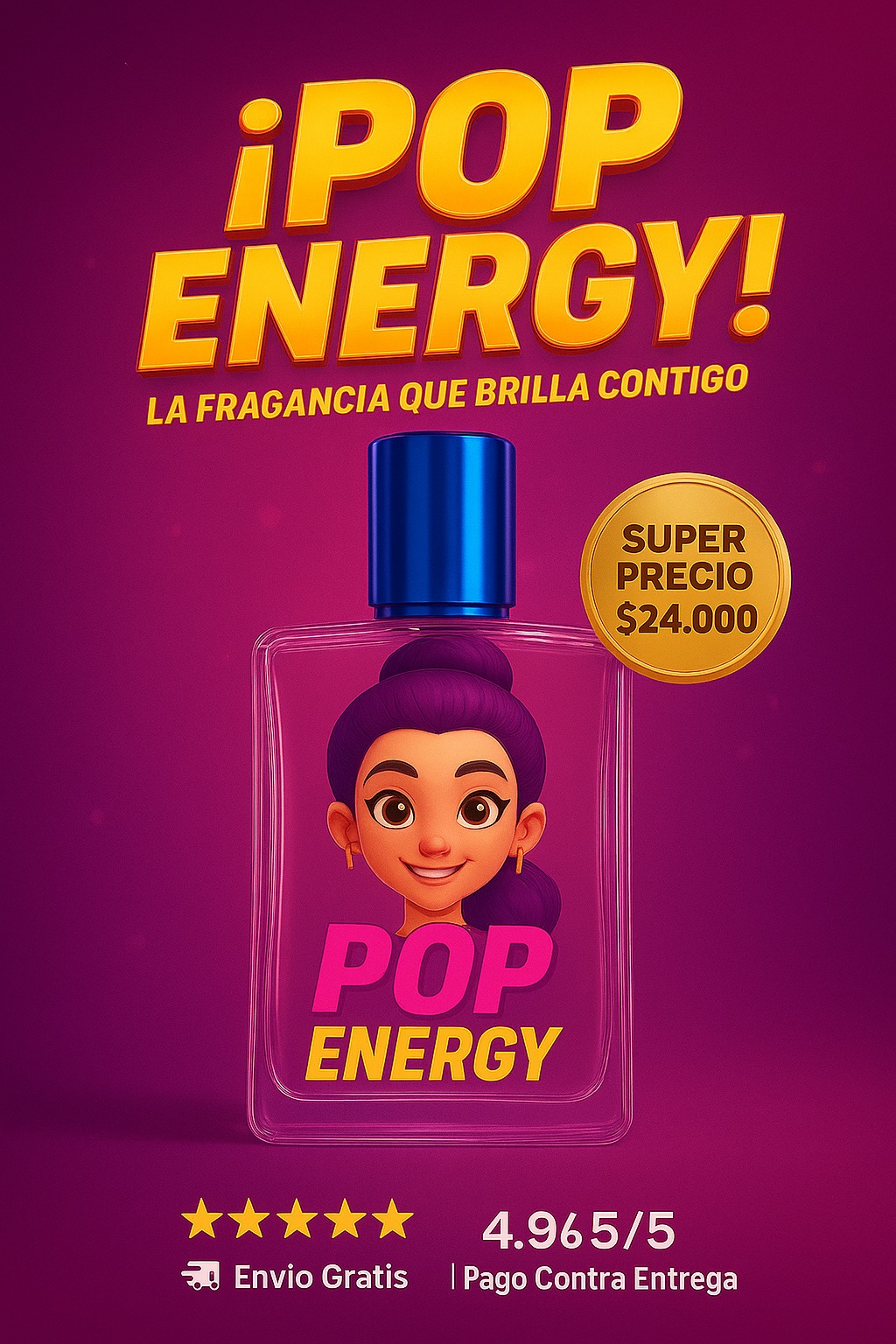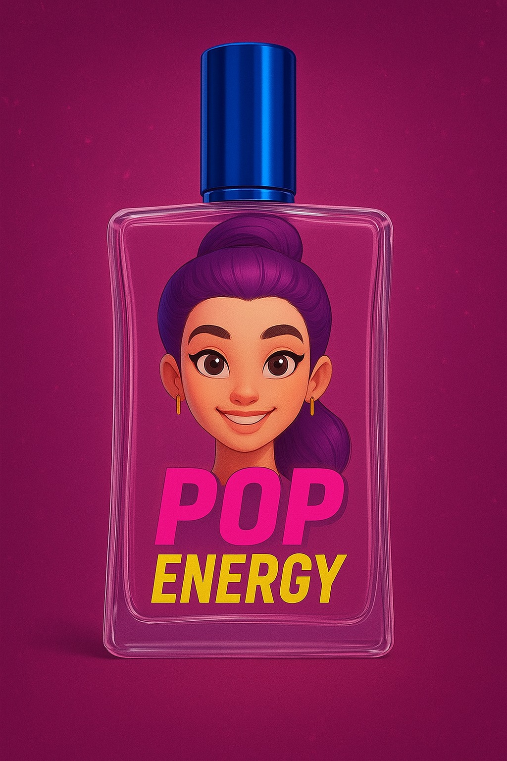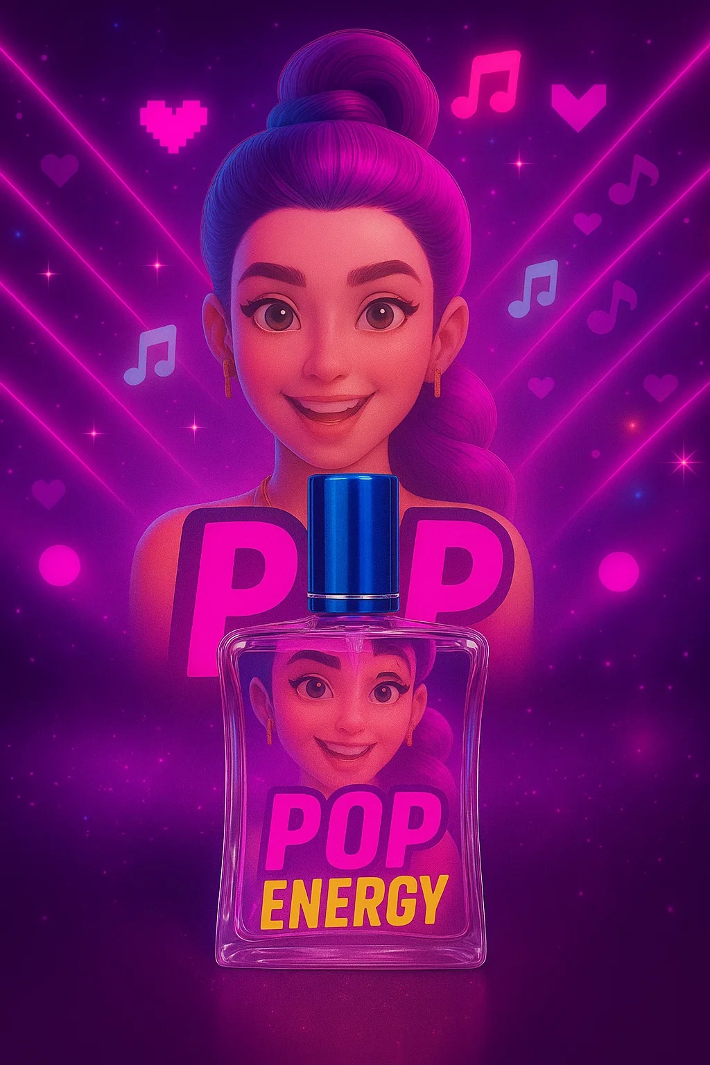 Su frasco refleja la esencia de una idol del K-Pop: colores neón, tapa metálica azul y una imagen icónica que simboliza estilo, confianza y brillo propio.