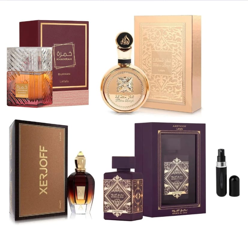 4 PERFUMES KHAMRA DUKHAN ESTUCHE ,LATAFFA FACKAR GOLD ESTUCHE ,ALEXANDRIA ,LATAFFA MORADA ESTUCHE .UN PERFUMERO RECARGABLE