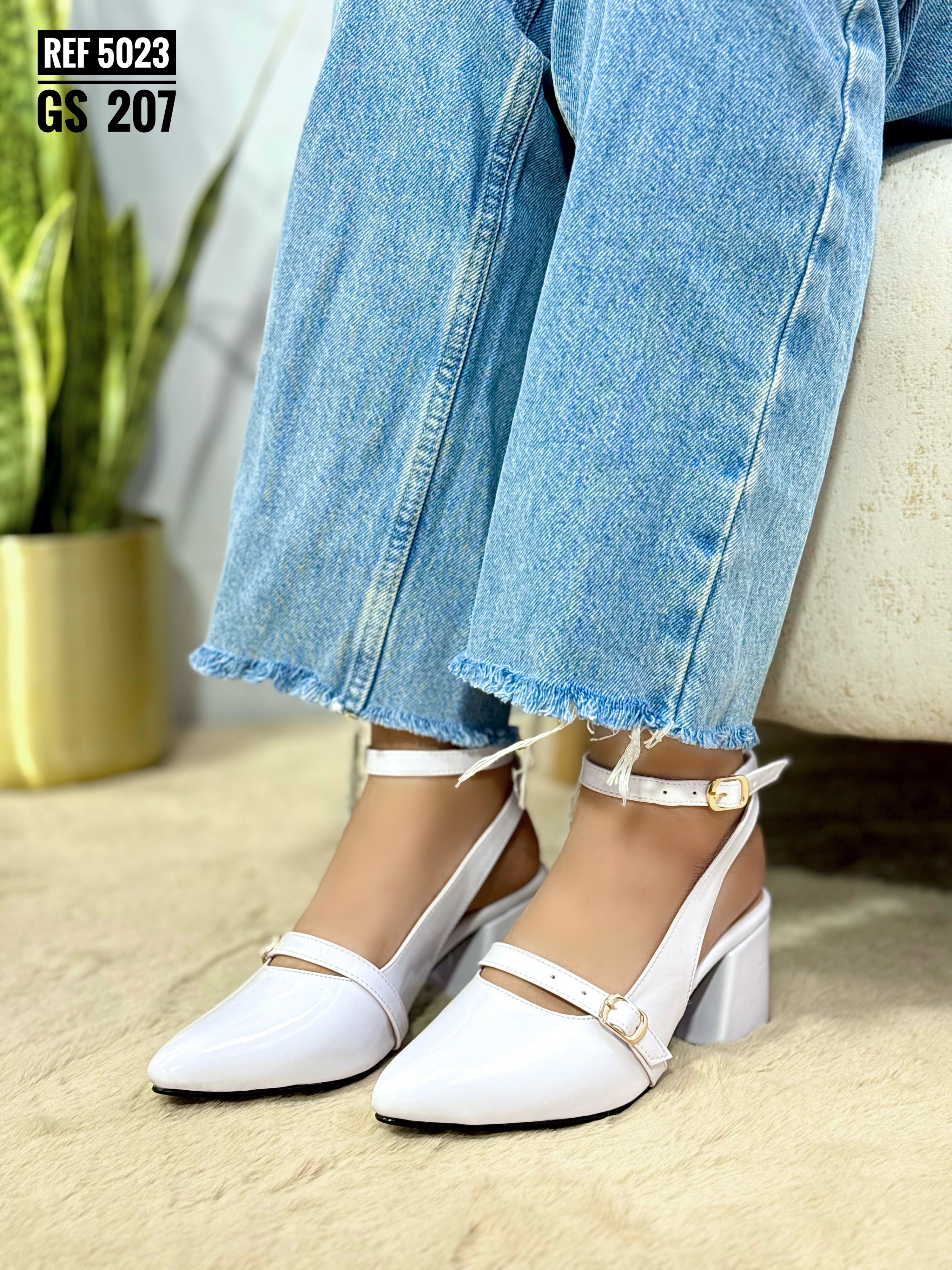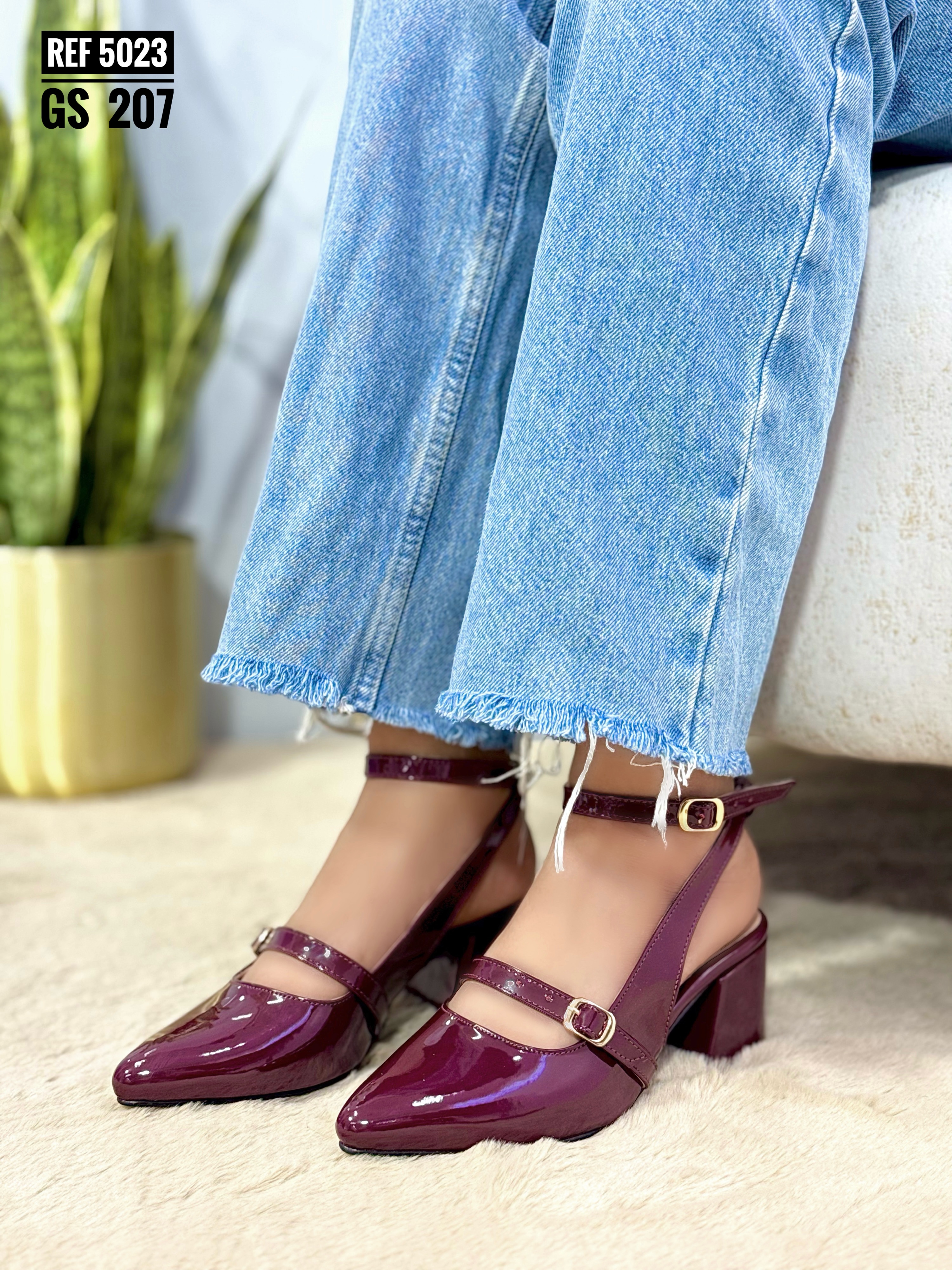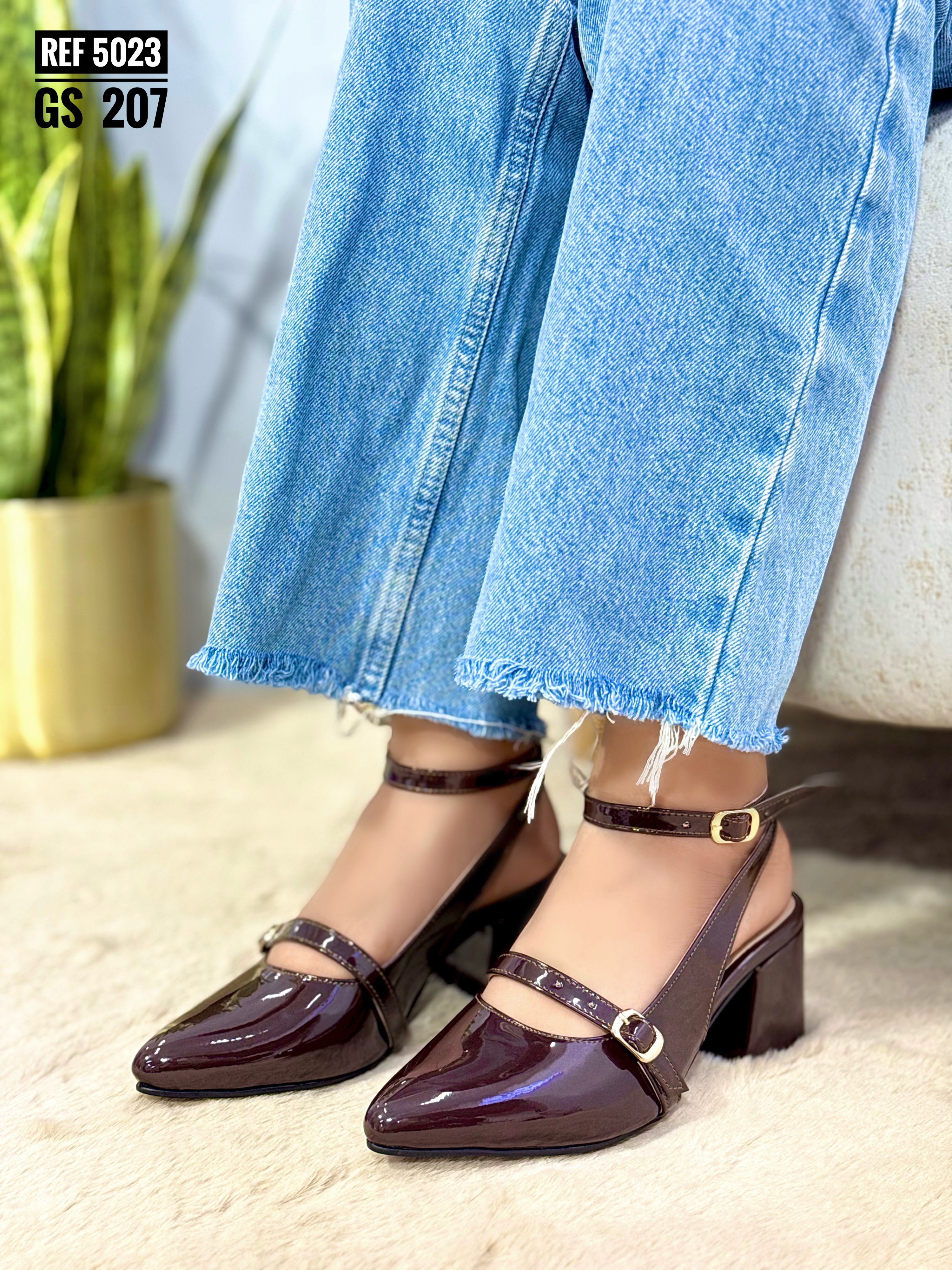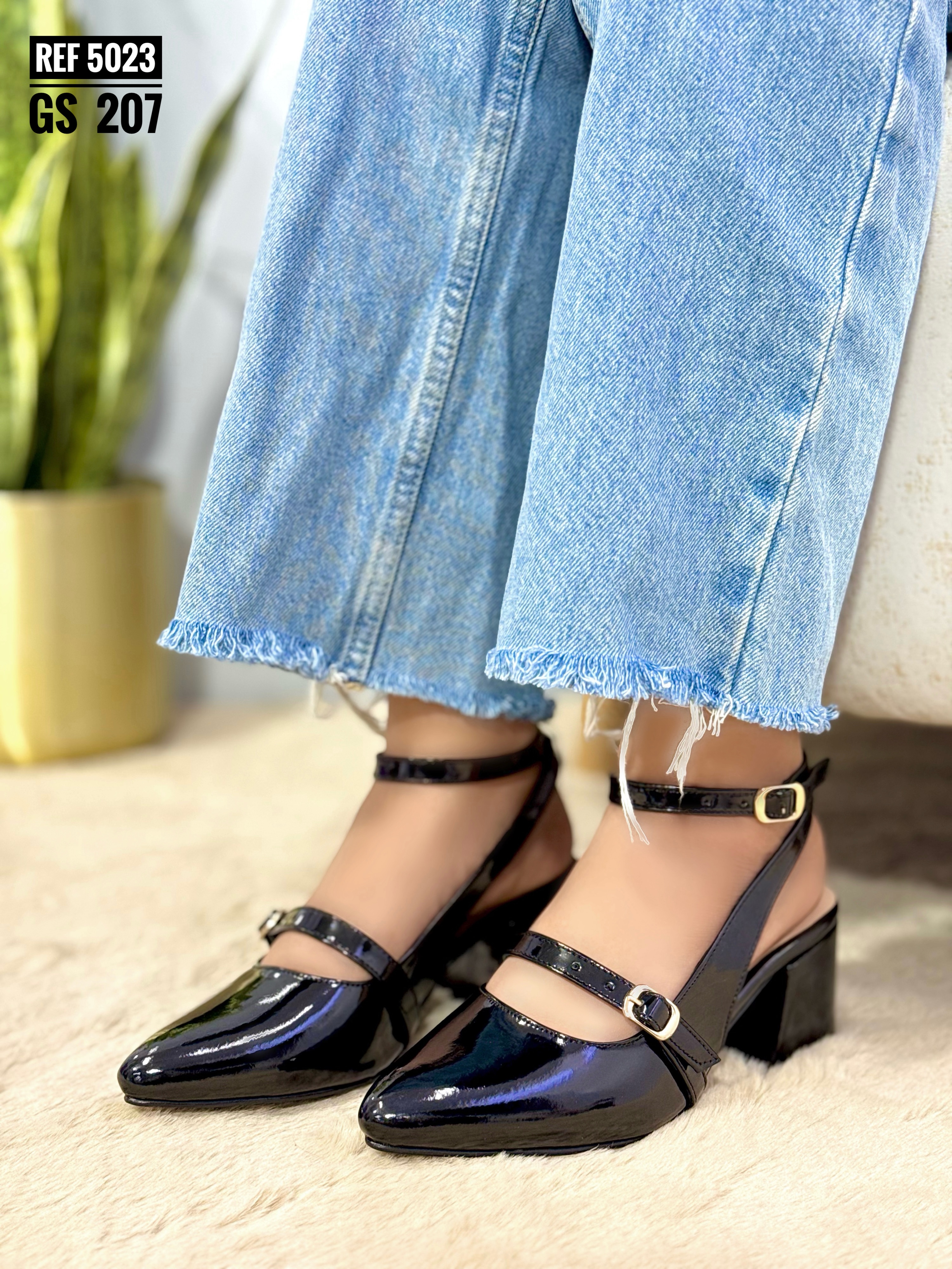 Un diseño elegante y moderno que combina la comodidad del tacón bajo con el brillo sofisticado del charol. Este modelo tipo Mary Jane estiliza el pie con su punta fina y su doble correa ajustable con hebilla dorada, perfecta para realzar cualquier look —desde un outfit casual con jeans hasta una propuesta más formal.