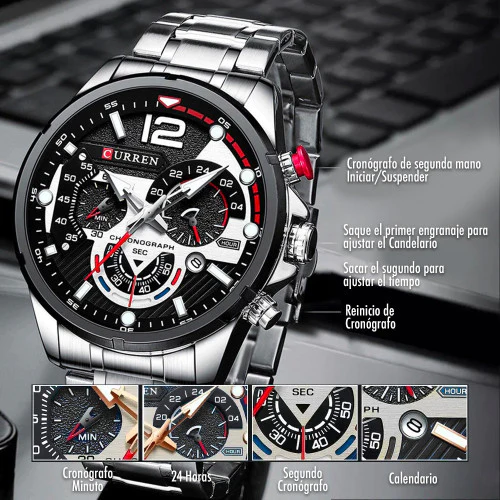 1. El reloj cronógrafo cuenta con esfera pequeña de segundos, esfera pequeña de minutos, esfera pequeña de hora militar (24 horas).