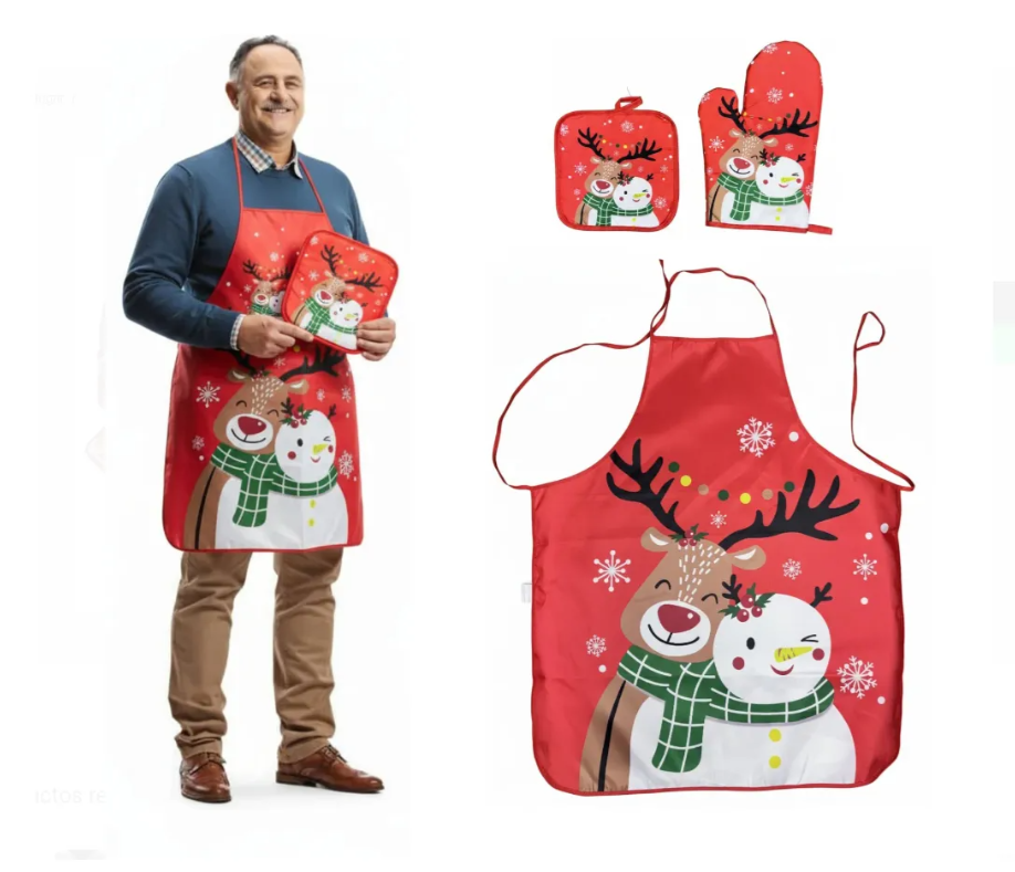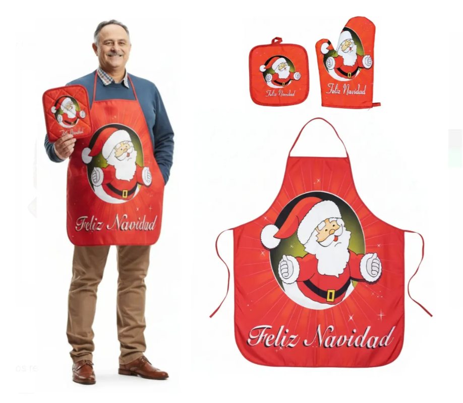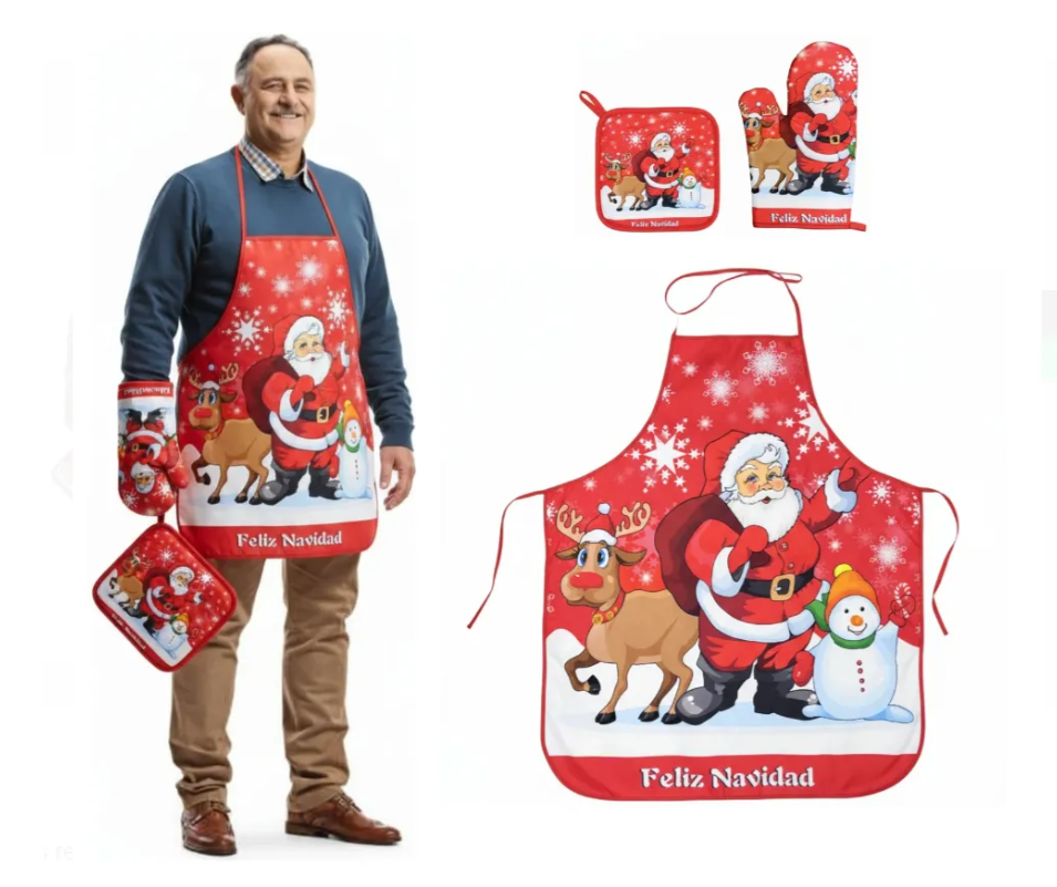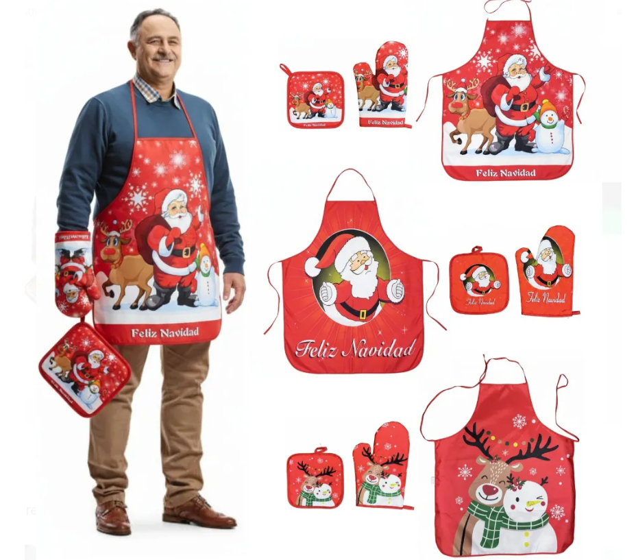 No dejes pasar la oportunidad de hacer de cada comida un momento especial. Con el Set Delantal x3 Navideño decorativo, cada plato que prepares será un reflejo de la alegría y el espíritu de la temporada.