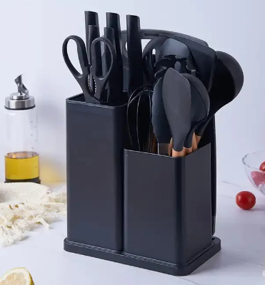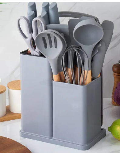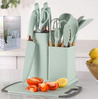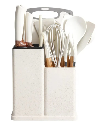- El juego de utensilios incluye todo lo que necesita para facilitar su cocina, como cuchillo de chef, cuchillo para rebanar, cuchillo para pan, cuchillo para uso general, cuchillo para frutas, espátula, espátula ranurada, cucharón de sopa profundo, cucharón de sopa poco profundo, colador, cuchara para pasta. , espátula plana, raspador, cepillo para rociar, batidor de huevos, pinzas para alimentos, tabla de cortar, tijeras y soporte para cortadores, que satisfacen plenamente sus necesidades culinarias diarias.
